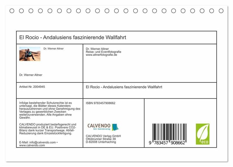 El Rocio ist als Wallfahrtsort weit über die Grenzen Spaniens bekannt. Verehrt wird zu Pfingsten die Heilige Jungfrau von El Rocio, auch als "Blanca Paloma" (Weiße Taube) bezeichnet. Die Wallfahrt ist ein hinreißendes Fest mit geschmückten Kutschen, Frauen in Flamencokleidern und Hunderte von Reitern in spanischer Tracht. Der Reisefotograf Dr. Werner Altner hat diese Atmosphäre in 13 farbenfrohen lebendigen Fotos eingefangen.