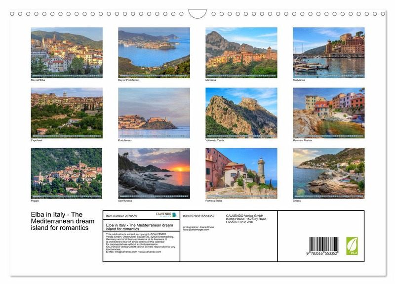 QUALITY - High-quality photo calendar with 12 beautiful images on light-resistant paper, robust spiral binding with hanger.SUSTAINABLE - Significant waste reduction due to print-on-demand production, environmentally friendly FSC-certified paper, produced in the UK, climate-conscious logistical processes.PERFECT GIFT - calendars for friends and family, for children, all ages and all occasions, from Christmas to birthdays and everything in between.LOTS OF CHOICE - Wall calendars in different sizes (DIN A4 and DIN A3), for any topic and personal taste, featuring photography, painting and illustrations.Some say, Elba is the most beautiful island in Italy..., author: Joana Kruse