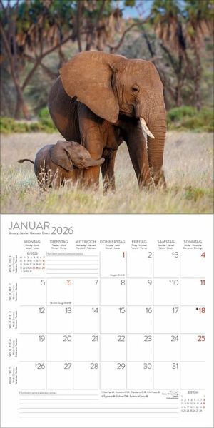 Elefanten, die intelligenten und sanften Riesen, faszinieren die Menschen auf besondere Weise. 12 beeindruckende Aufnahmen der beliebten Dickhäuter zeigt dieser praktische Kalender, der viel Platz für Eintragungen bietet.