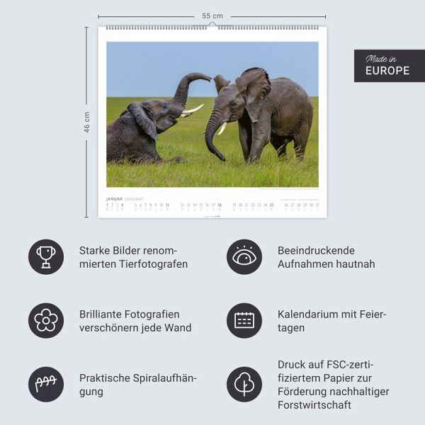 - Die sanften Riesen Afrikas: Schöne Elefanten-Bilder in einem Wandkalender XXL- Spektakuläre Naturaufnahmen in der Wildnis des afrikanischen Kontinents: Elefanten-Babys mit Familie, Einzelgänger und große Herden der Dickhäuter im Porträt- Wild und frei: Bewundern Sie Monat für Monat poetisch-einfühlsame Fotos von Elefanten- Dekorativer Blickfang und stimmungsvolles Highlight: Jahres-Wandkalender 2026 im Format 55 x 46 cm- Natur in ihrer ganzen Vielfalt: Die Tierkalender 2026 von Weingarten im Athesia KalenderverlagSprachen: Deutsch, Englisch