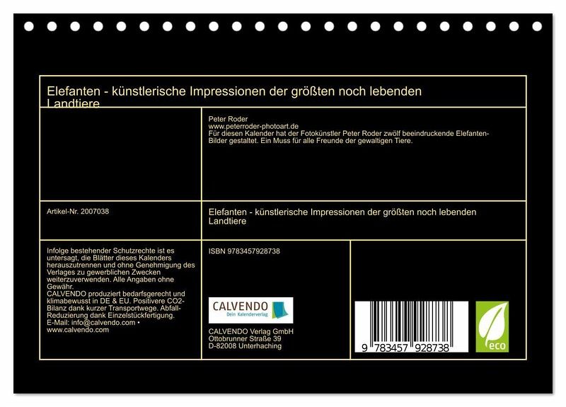 QUALITÄT - Hochwertiger Fotokalender mit 12 wunderschönen Motiven auf lichtbeständigem Bilderdruckpapier, robuste Spiralbindung.NACHHALTIG - deutliche Abfallreduzierung durch bedarfsgerechte Einzelstückfertigung, umweltfreundliches FSC-zertifiziertes Papier, Produktion in Deutschland, klimabewusste Logistik.PERFEKTES GESCHENK - Kalender für Freunde und Familie, für Kinder und Erwachsene, jung und alt, zu Weihnachten, Geburtstag oder zwischendurch.VIELFALT - Bildkalender in verschiedenen Formaten, z.B. DIN A5, DIN A4, DIN A3 sowie DIN A2. Ob Naturmotiv, Gemälde oder Fotos, ideal für ein persönliches Wohlfühlambiente.Beeindruckende Darstellungen der großen Rüsseltiere, die sowohl in Afrika als auch in Asien beheimatet sind. von Autor(in): Peter Roder