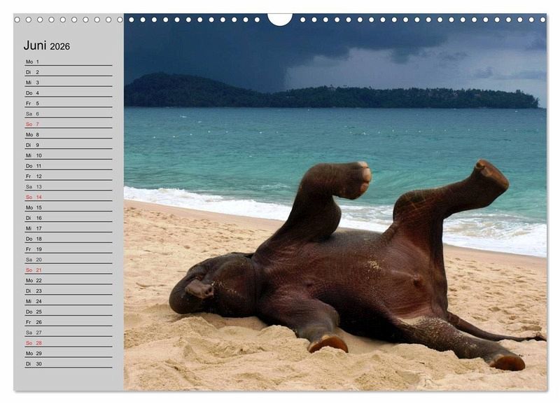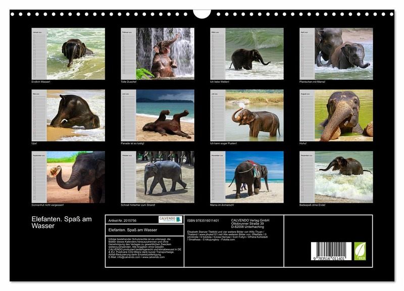Dieser Kalender gehört zu den Calvendo Bestsellern. Welchen Spaß Elefanten beim spielen am Strand und beim Baden im Meer haben, zeigen diese wunderschönen Bilder. Es ist eine Freude das Elefantenbaby an Thailands Strand anzuschauen. Ein bezaubernder Planer für die ganze Familie.