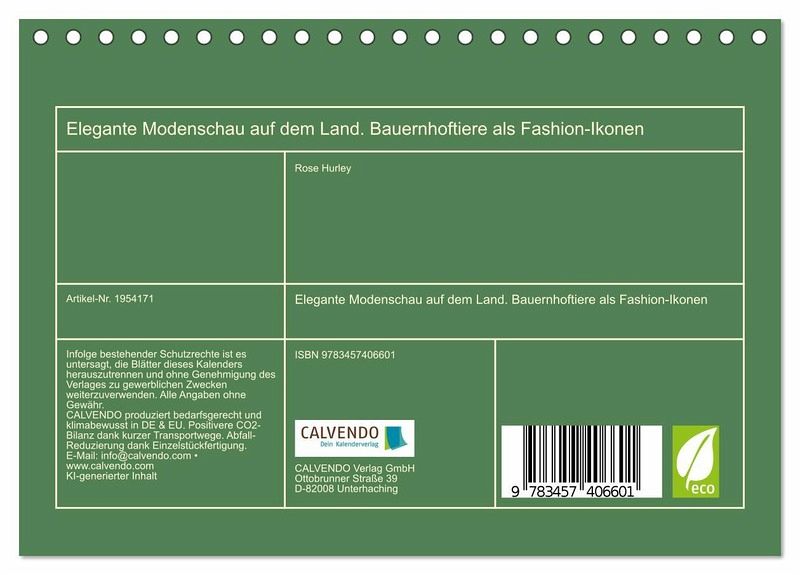 QUALITÄT - Hochwertiger Fotokalender mit 12 wunderschönen Motiven auf lichtbeständigem Bilderdruckpapier, robuste Spiralbindung.NACHHALTIG - deutliche Abfallreduzierung durch bedarfsgerechte Einzelstückfertigung, umweltfreundliches FSC-zertifiziertes Papier, Produktion in Deutschland, klimabewusste Logistik.PERFEKTES GESCHENK - Kalender für Freunde und Familie, für Kinder und Erwachsene, jung und alt, zu Weihnachten, Geburtstag oder zwischendurch.VIELFALT - Bildkalender in verschiedenen Formaten, z.B. DIN A5, DIN A4, DIN A3 sowie DIN A2. Ob Naturmotiv, Gemälde oder Fotos, ideal für ein persönliches Wohlfühlambiente.Ein Jahr mit tollen Tiermodels in edler Landhausmode von Autor(in): Rose Hurley