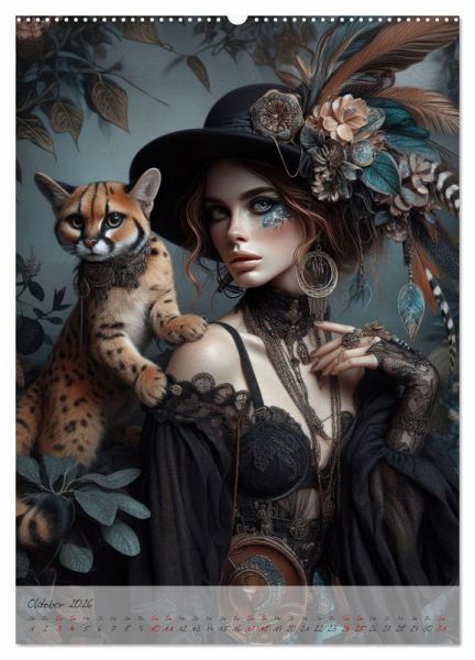 Oktober: Femme Fatale mit Katzenaugen und einer Wildkatze auf der Schulter
