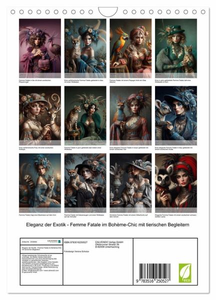 Tauchen Sie ein in eine Welt voller Eleganz und Exotik mit dem Kalender "Eleganz der Exotik: Femme Fatale im Bohème-Chic mit tierischen Begleitern". Lassen Sie sich verzaubern von durch KI generierten, atemberaubenden Bildern, die sinnliche Frauen in stilvollen Bohème-Outfits zeigen, begleitet von faszinierenden, abstrakten exotischen Tieren.