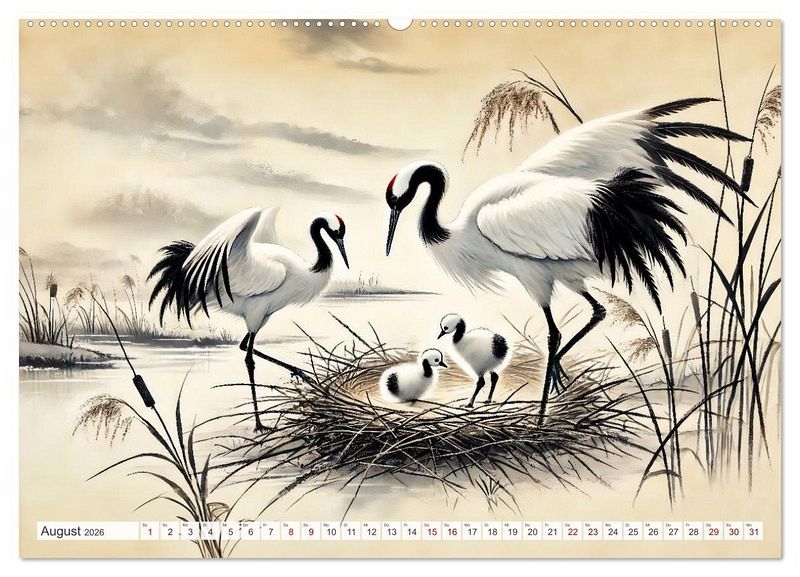 Jede der kunstvollen Illustrationen zeigt Kraniche in ihrer natürlichen Pracht, dargestellt mit fließenden Linien und sanften Farbnuancen, die die Essenz dieser edlen Vögel hervorheben. Die minimalistischen Kompositionen strahlen Ruhe und Gelassenheit aus und verwandeln jeden Monat in einen visuellen Genuss.