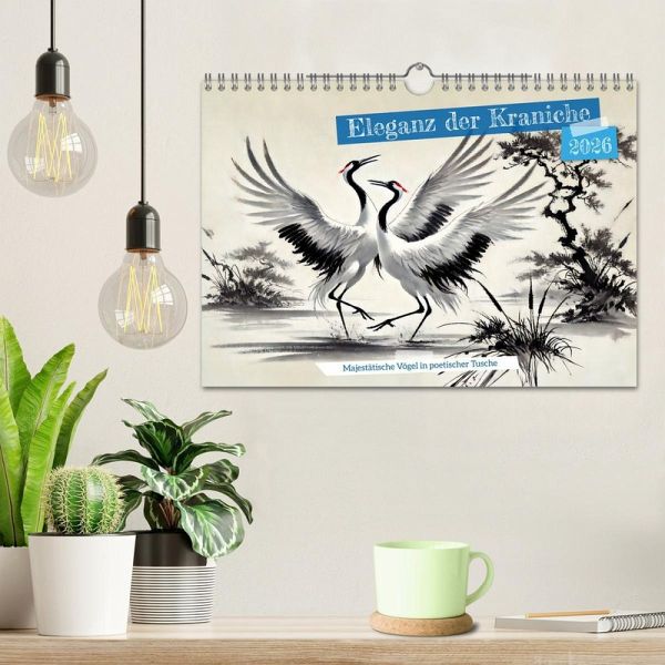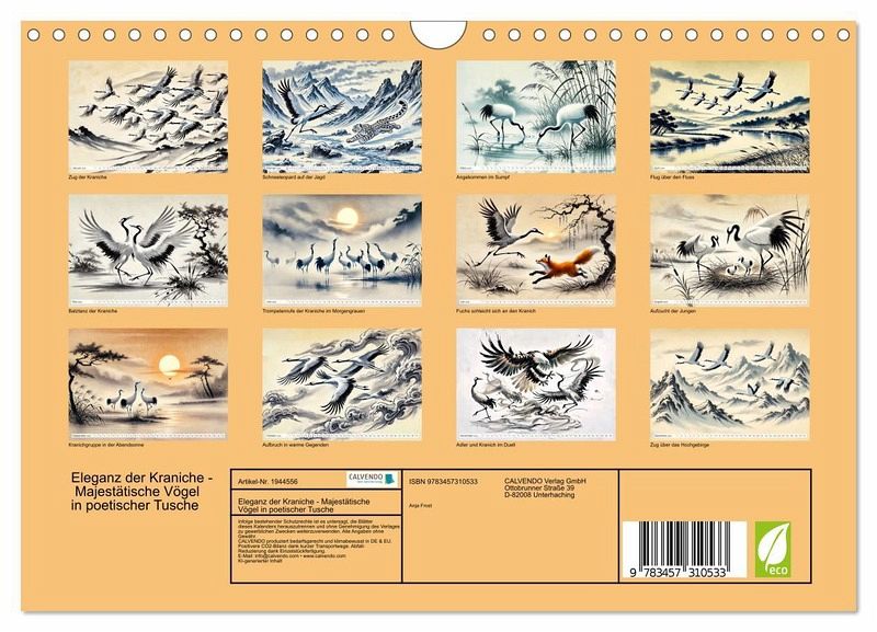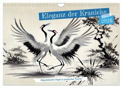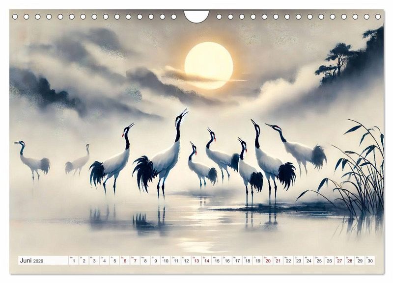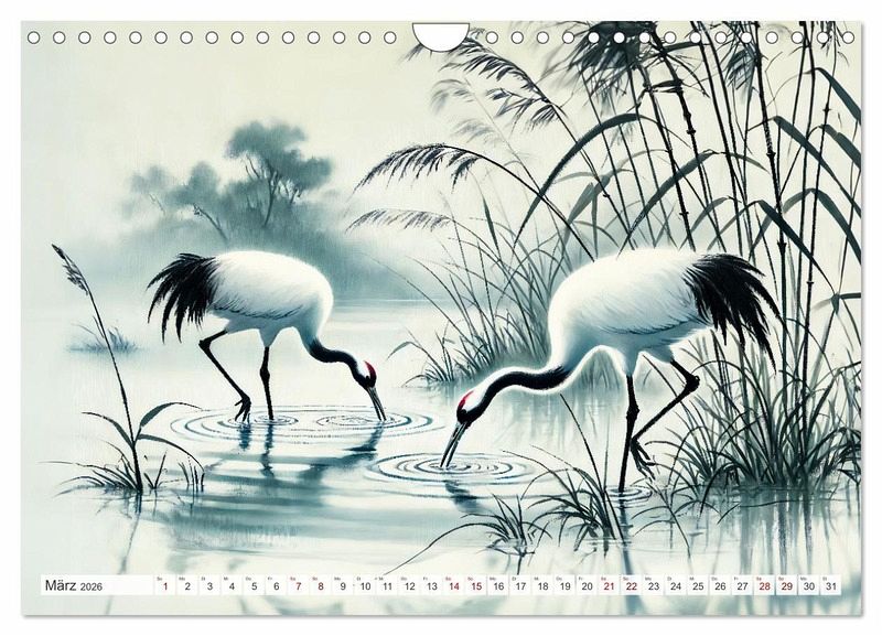 Jede der kunstvollen Illustrationen zeigt Kraniche in ihrer natürlichen Pracht, dargestellt mit fließenden Linien und sanften Farbnuancen, die die Essenz dieser edlen Vögel hervorheben. Die minimalistischen Kompositionen strahlen Ruhe und Gelassenheit aus und verwandeln jeden Monat in einen visuellen Genuss.