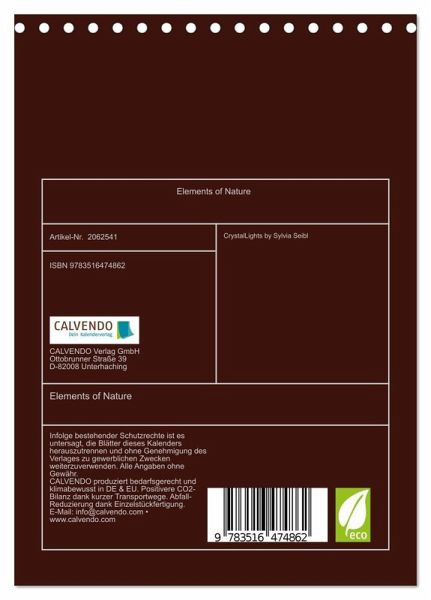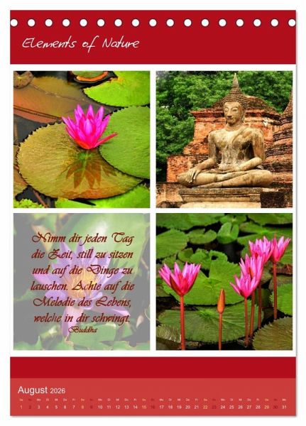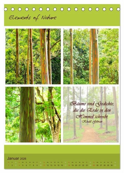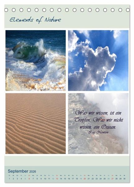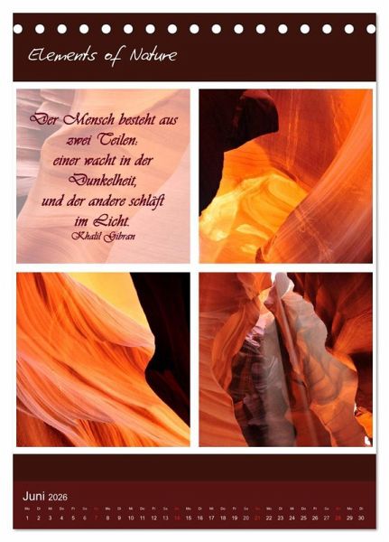 Elements of Nature ist ein besonder Kalender mit dem Sie jeden Monat neu auf eindrucksvolle Art die verschiedenen Farben, Formen und Lichter der Natur erleben können, begleitet von tiefgehenden weisen Sprüchen und Zitaten geben die Eindrücke Inspiration für die Seele.