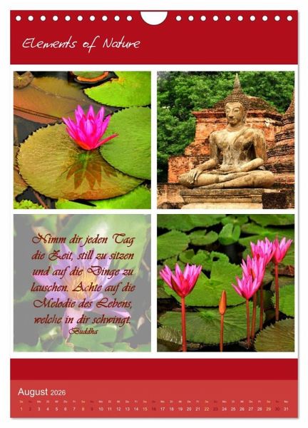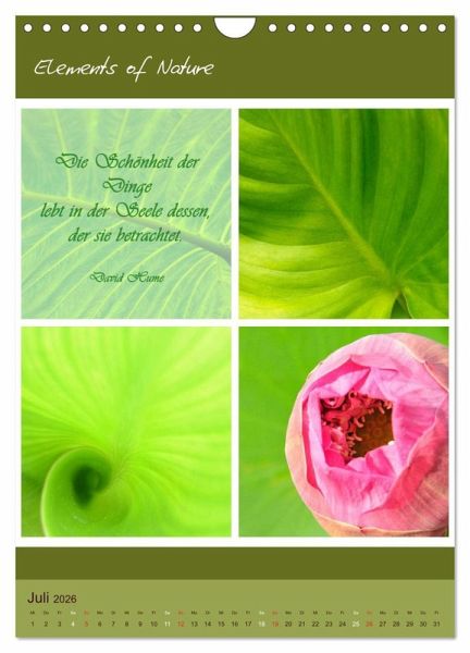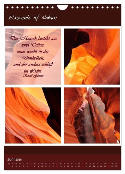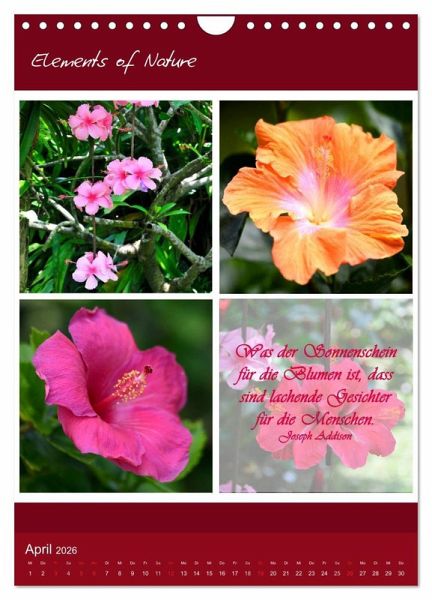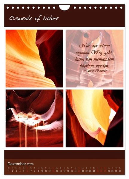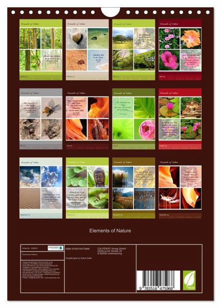 Elements of Nature ist ein besonder Kalender mit dem Sie jeden Monat neu auf eindrucksvolle Art die verschiedenen Farben, Formen und Lichter der Natur erleben können, begleitet von tiefgehenden weisen Sprüchen und Zitaten geben die Eindrücke Inspiration für die Seele.
