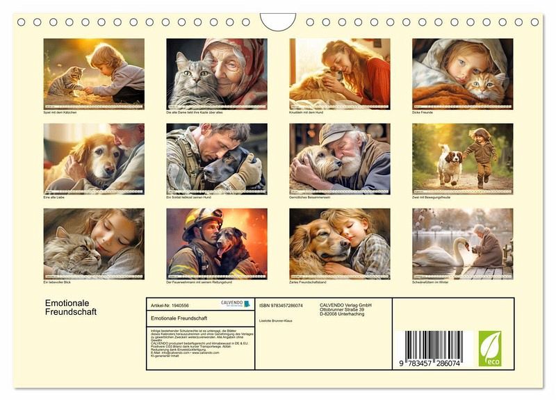 QUALITÄT - Hochwertiger Fotokalender mit 12 wunderschönen Motiven auf lichtbeständigem Bilderdruckpapier, robuste Spiralbindung mit Aufhängebügel.NACHHALTIG - deutliche Abfallreduzierung durch bedarfsgerechte Einzelstückfertigung, umweltfreundliches FSC-zertifiziertes Papier, Produktion in Deutschland, klimabewusste Logistik.PERFEKTES GESCHENK - Kalender für Freunde und Familie, für Kinder und Erwachsene, jung und alt, zu Weihnachten, Geburtstag oder zwischendurch.VIELFALT - Bildkalender in verschiedenen Formaten, z.B. DIN A5, DIN A4, DIN A3 sowie DIN A2. Ob Naturmotiv, Gemälde oder Fotos, ideal für ein persönliches Wohlfühlambiente.Innige Beziehungen zwischen Mensch und Tier von Autor(in): Liselotte Brunner-Klaus