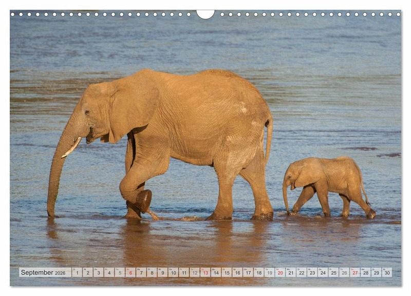 September: September: Eine Elefantenmama führt ihr Baby durch den Fluss.