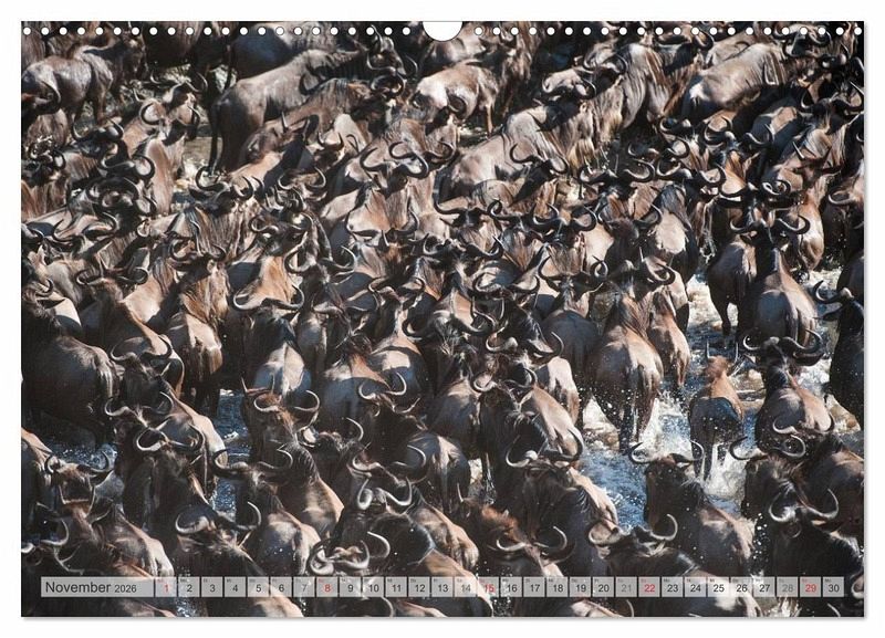 November: November: Tausende von Gnus durchqueren den Mara-River in der Maasai Mara.