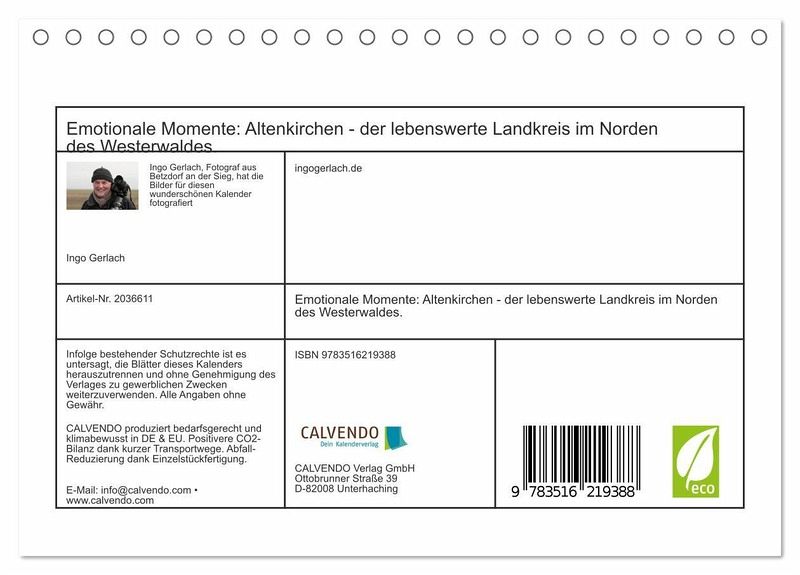 QUALITÄT - Hochwertiger Fotokalender mit 12 wunderschönen Motiven auf lichtbeständigem Bilderdruckpapier, robuste Spiralbindung.NACHHALTIG - deutliche Abfallreduzierung durch bedarfsgerechte Einzelstückfertigung, umweltfreundliches FSC-zertifiziertes Papier, Produktion in Deutschland, klimabewusste Logistik.PERFEKTES GESCHENK - Kalender für Freunde und Familie, für Kinder und Erwachsene, jung und alt, zu Weihnachten, Geburtstag oder zwischendurch.VIELFALT - Bildkalender in verschiedenen Formaten, z.B. DIN A5, DIN A4, DIN A3 sowie DIN A2. Ob Naturmotiv, Gemälde oder Fotos, ideal für ein persönliches Wohlfühlambiente.Ingo Gerlach, Fotograf aus Betzdorf an der Sieg, hat die Bilder für diesen wunderschönen Kalender fotografiert. von Autor(in): Ingo Gerlach