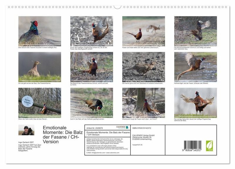 PREMIUM-LINIE - Brillanter Fotokalender mit 12 wunderschönen Motiven, Kunstdruck in Hochglanz in Museumsqualität.QUALITÄT - edle Materialien, stabile Rückwand mit 2 innovativen Einstecktaschen für eine optimale Präsentation an der Wand.NACHHALTIG - deutliche Abfallreduzierung durch bedarfsgerechte Einzelstückfertigung, umweltfreundliches FSC-zertifiziertes Papier, Produktion in Deutschland, klimabewusste Logistik.PERFEKTES GESCHENK - Kalender für Freunde und Familie, für Kinder und Erwachsene, jung und alt, zu Weihnachten, Geburtstag oder zwischendurch.Die Balz der Fasane ist exotisch und dramatisch zugleich. Ingo Gerlach GDT hat dies in wunderschönen Bildern festgehalten. von Autor(in): Ingo Gerlach