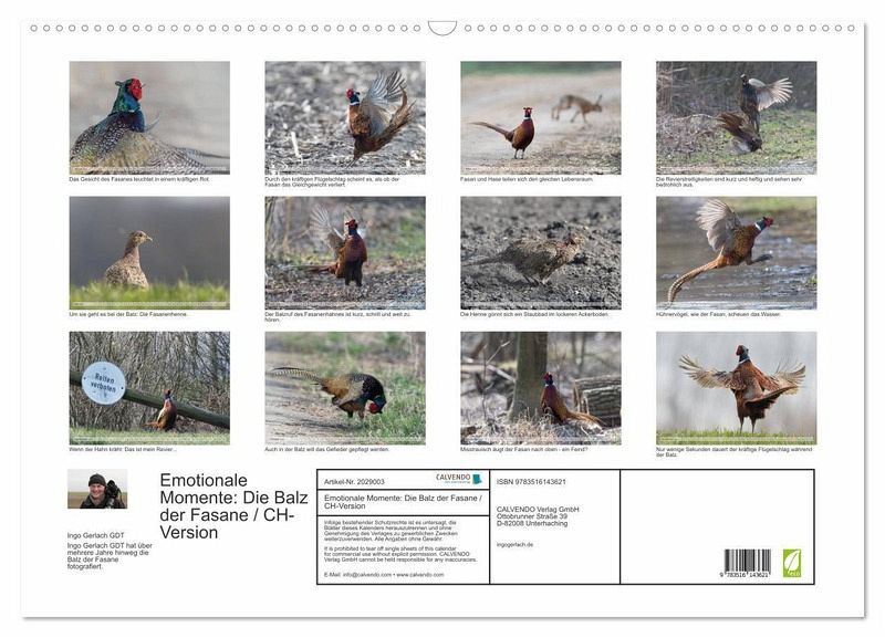 QUALITÄT - Hochwertiger Fotokalender mit 12 wunderschönen Motiven auf lichtbeständigem Bilderdruckpapier, robuste Spiralbindung mit Aufhängebügel.NACHHALTIG - deutliche Abfallreduzierung durch bedarfsgerechte Einzelstückfertigung, umweltfreundliches FSC-zertifiziertes Papier, Produktion inDeutschland, klimabewusste Logistik.PERFEKTES GESCHENK - Kalender für Freunde und Familie, für Kinder und Erwachsene, jung und alt, zu Weihnachten, Geburtstag oder zwischendurch.VIELFALT - Bildkalender in verschiedenen Formaten, z.B. DIN A5, DIN A4, DIN A3 sowie DIN A2. Ob Naturmotiv, Gemälde oder Fotos, ideal für ein persönliches Wohlfühlambiente.Die Balz der Fasane ist exotisch und dramatisch zugleich. Ingo Gerlach GDT hat dies in wunderschönen Bildern festgehalten. von Autor(in): Ingo Gerlach