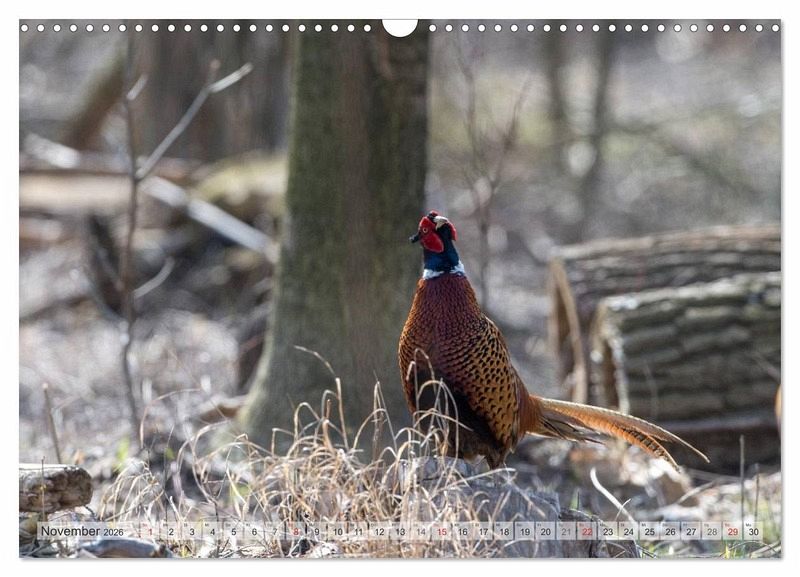 Januar: Das Gesicht des Fasanes leuchtet in einem kräftigen Rot.
