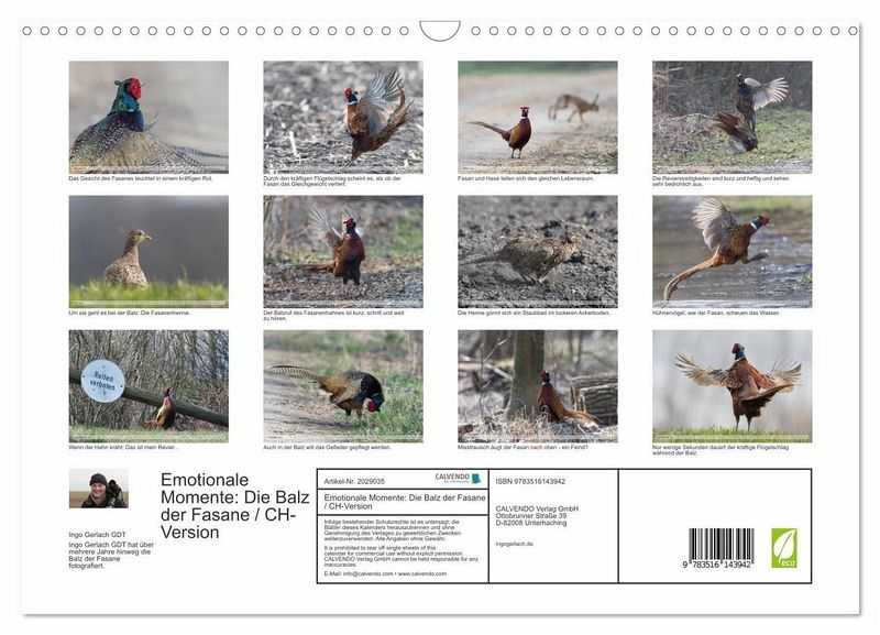 QUALITÄT - Hochwertiger Fotokalender mit 12 wunderschönen Motiven auf lichtbeständigem Bilderdruckpapier, robuste Spiralbindung mit Aufhängebügel.NACHHALTIG - deutliche Abfallreduzierung durch bedarfsgerechte Einzelstückfertigung, umweltfreundliches FSC-zertifiziertes Papier, Produktion inDeutschland, klimabewusste Logistik.PERFEKTES GESCHENK - Kalender für Freunde und Familie, für Kinder und Erwachsene, jung und alt, zu Weihnachten, Geburtstag oder zwischendurch.VIELFALT - Bildkalender in verschiedenen Formaten, z.B. DIN A5, DIN A4, DIN A3 sowie DIN A2. Ob Naturmotiv, Gemälde oder Fotos, ideal für ein persönliches Wohlfühlambiente.Die Balz der Fasane ist exotisch und dramatisch zugleich. Ingo Gerlach GDT hat dies in wunderschönen Bildern festgehalten. von Autor(in): Ingo Gerlach