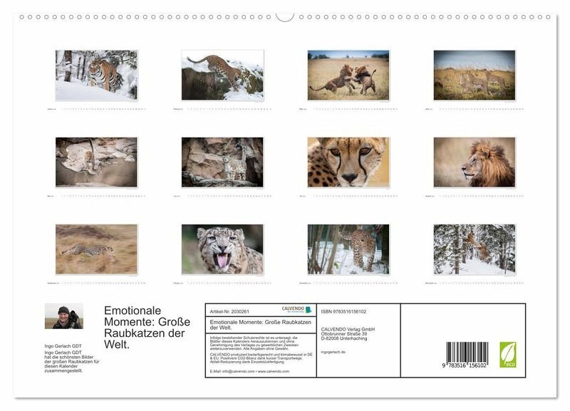 PREMIUM-LINIE - Brillanter Fotokalender mit 12 wunderschönen Motiven, Kunstdruck in Hochglanz in Museumsqualität.QUALITÄT - edle Materialien, stabile Rückwand mit 2 innovativen Einstecktaschen für eine optimale Präsentation an der Wand.NACHHALTIG - deutliche Abfallreduzierung durch bedarfsgerechte Einzelstückfertigung, umweltfreundliches FSC-zertifiziertes Papier, Produktion in Deutschland, klimabewusste Logistik.PERFEKTES GESCHENK - Kalender für Freunde und Familie, für Kinder und Erwachsene, jung und alt, zu Weihnachten, Geburtstag oder zwischendurch.Ob Tiger, Leopard oder Löwe - die große Raubkatzen der Welt sind äußerst beliebte Motive. Ingo Gerlach GDT hat die schönsten für diesen Kalender ausgesucht. von Autor(in): Ingo Gerlach