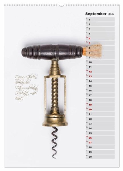 Korkenzieher sind das wichtigste Werkzeug für den Weinkenner und Weinliebhaber. Seit Jahrhunderten wurden Korkenzieher stetig weiterentwickelt. Am schönsten sind die Korkenzieher aus der Jahrhundertwende. Ob aus dem Deutschen Reich mit beweglicher Glocke oder der berühmte "Zi-Zag" aus Frankreich - die Korkenzieher in diesem Kalender spiegeln auch ein Stück Kulturgeschichte wider.