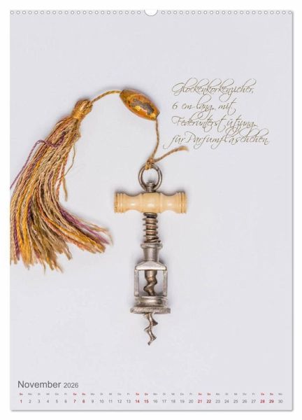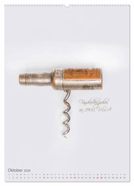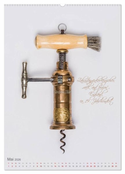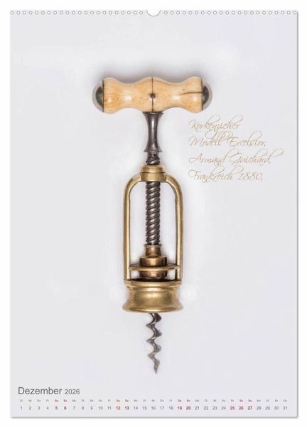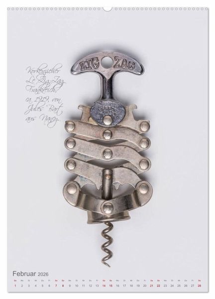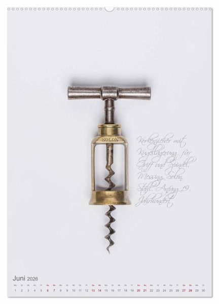 Korkenzieher sind das wichtigste Werkzeug für den Weinkenner und Weinliebhaber. Seit Jahrhunderten wurden Korkenzieher stetig weiterentwickelt. Am schönsten sind die Korkenzieher aus der Jahrhundertwende. Ob aus dem Deutschen Reich mit beweglicher Glocke oder der berühmte "Zi-Zag" aus Frankreich - die Korkenzieher in diesem Kalender spiegeln auch ein Stück Kulturgeschichte wider.