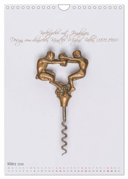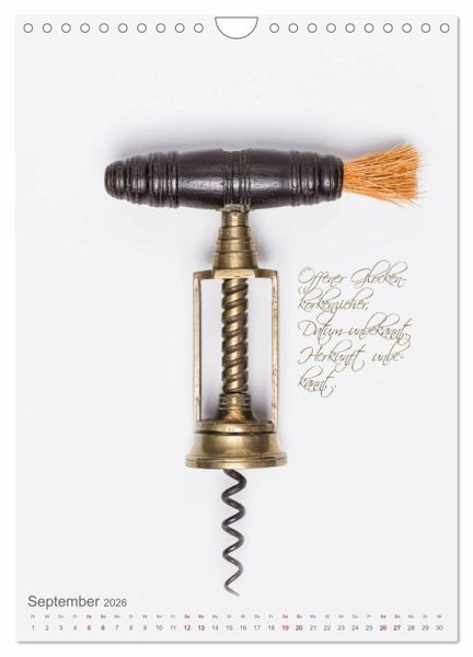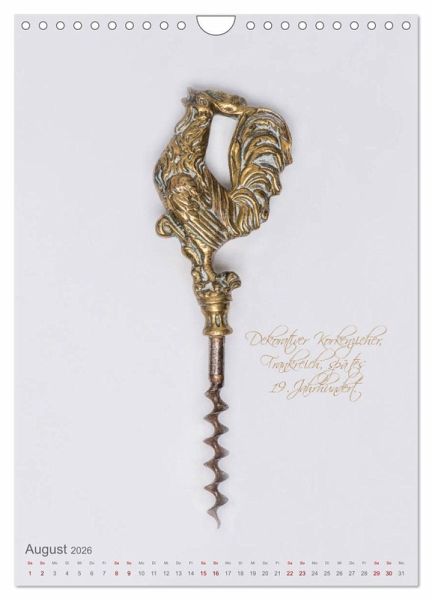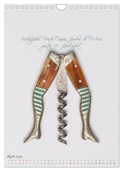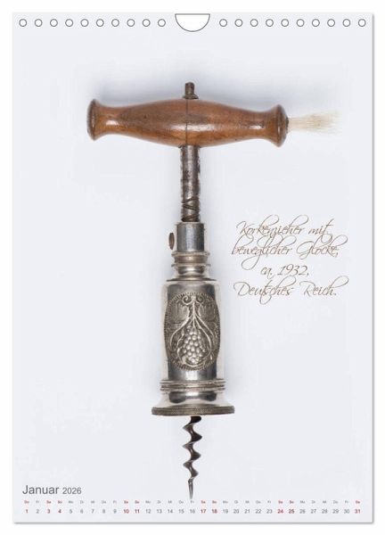 Korkenzieher sind das wichtigste Werkzeug für den Weinkenner und Weinliebhaber. Seit Jahrhunderten wurden Korkenzieher stetig weiterentwickelt. Am schönsten sind die Korkenzieher aus der Jahrhundertwende. Ob aus dem Deutschen Reich mit beweglicher Glocke oder der berühmte "Zi-Zag" aus Frankreich - die Korkenzieher in diesem Kalender spiegeln auch ein Stück Kulturgeschichte wider.