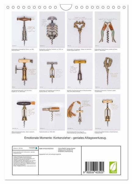 QUALITÄT - Hochwertiger Fotokalender mit 12 wunderschönen Motiven auf lichtbeständigem Bilderdruckpapier, robuste Spiralbindung mit Aufhängebügel.NACHHALTIG - deutliche Abfallreduzierung durch bedarfsgerechte Einzelstückfertigung, umweltfreundliches FSC-zertifiziertes Papier, Produktion in Deutschland, klimabewusste Logistik.PERFEKTES GESCHENK - Kalender für Freunde und Familie, für Kinder und Erwachsene, jung und alt, zu Weihnachten, Geburtstag oder zwischendurch.VIELFALT - Bildkalender in verschiedenen Formaten, z.B. DIN A5, DIN A4, DIN A3 sowie DIN A2. Ob Naturmotiv, Gemälde oder Fotos, ideal für ein persönliches Wohlfühlambiente.Dieser Kalender mit Korkenziehern aus mehreren Epoche und Regionen ist das dekorative Element für jeden Weinkenner und Weinliebhaber. von Autor(in): Ingo Gerlach