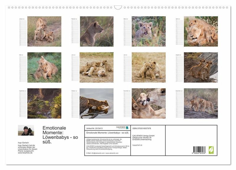 QUALITÄT - Hochwertiger Fotokalender mit 12 wunderschönen Motiven auf lichtbeständigem Bilderdruckpapier, robuste Spiralbindung mit Aufhängebügel.NACHHALTIG - deutliche Abfallreduzierung durch bedarfsgerechte Einzelstückfertigung, umweltfreundliches FSC-zertifiziertes Papier, Produktion in Deutschland, klimabewusste Logistik.PERFEKTES GESCHENK - Kalender für Freunde und Familie, für Kinder und Erwachsene, jung und alt, zu Weihnachten, Geburtstag oder zwischendurch.VIELFALT - Bildkalender in verschiedenen Formaten, z.B. DIN A5, DIN A4, DIN A3 sowie DIN A2. Ob Naturmotiv, Gemälde oder Fotos, ideal für ein persönliches Wohlfühlambiente.Quirlige Löwenbabys in freier Wildbahn fotografiert, Bilder die besonders bezaubern. von Autor(in): Ingo Gerlach