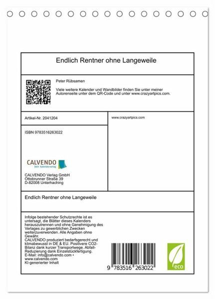 QUALITÄT - Hochwertiger Fotokalender mit 12 wunderschönen Motiven auf lichtbeständigem Bilderdruckpapier, robuste Spiralbindung.NACHHALTIG - deutliche Abfallreduzierung durch bedarfsgerechte Einzelstückfertigung, umweltfreundliches FSC-zertifiziertes Papier, Produktion in Deutschland, klimabewusste Logistik.PERFEKTES GESCHENK - Kalender für Freunde und Familie, für Kinder und Erwachsene, jung und alt, zu Weihnachten, Geburtstag oder zwischendurch.VIELFALT - Bildkalender in verschiedenen Formaten, z.B. DIN A5, DIN A4, DIN A3 sowie DIN A2. Ob Naturmotiv, Gemälde oder Fotos, ideal für ein persönliches Wohlfühlambiente.Mit diesen lustigen Ideen gibt es als Rentner keine Langeweile von Autor(in): Peter Rübsamen