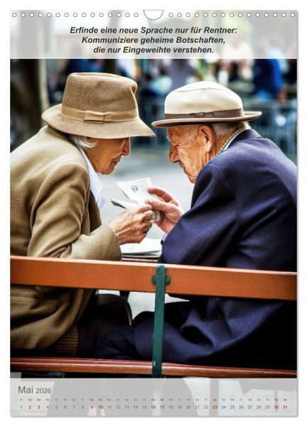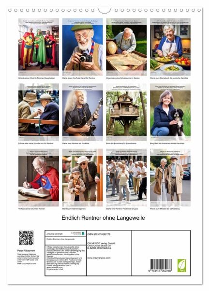 QUALITÄT - Hochwertiger Fotokalender mit 12 wunderschönen Motiven auf lichtbeständigem Bilderdruckpapier, robuste Spiralbindung mit Aufhängebügel.NACHHALTIG - deutliche Abfallreduzierung durch bedarfsgerechte Einzelstückfertigung, umweltfreundliches FSC-zertifiziertes Papier, Produktion in Deutschland, klimabewusste Logistik.PERFEKTES GESCHENK - Kalender für Freunde und Familie, für Kinder und Erwachsene, jung und alt, zu Weihnachten, Geburtstag oder zwischendurch.VIELFALT - Bildkalender in verschiedenen Formaten, z.B. DIN A5, DIN A4, DIN A3 sowie DIN A2. Ob Naturmotiv, Gemälde oder Fotos, ideal für ein persönliches Wohlfühlambiente.Mit diesen lustigen Ideen gibt es als Rentner keine Langeweile von Autor(in): Peter Rübsamen