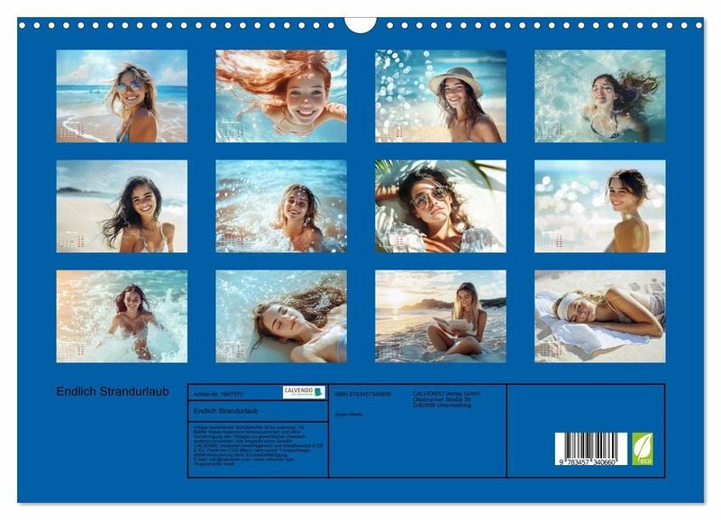 Bald ist es endlich wieder soweit. Der langersehnte Urlaub am Strand ist endlich da, hurra. Sommer, Sonne, Sand und Meer, wie lange haben wir das vermisst. Der schönste Moment des Jahres. Abschalten vom Alltag. Geist und Körper wieder auf Vordermann bringen. Die salzige Meeresbrise auf der Haut spüren, die Haare vom Wind zerzausen lassen oder ganz einfach einmal in das kühle Nass springen und die Kühle des Meeres um sich herum am gesamten Körper fühlen. Dieser Kalender, der mit Hilfe von KI entstand, schwelgt in Erinnerungen und in Vorfreude. Denn der nächste Sommer kommt ganz bestimmt.