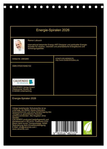 Alles in unserer Welt - sogar das für unser Auge Unsichtbare - ist Energie und Schwingung und erscheint noch lebendiger durch Licht und Farbe. Alles, vom kleinsten Elementarteilchen bis hin zur universellen Spiral-Galaxie, bewegt und dreht sich, bildet eine Spirale oder gestaltet sich kreisförmig. Die vorliegenden Energiespiralen vermitteln einen kleinen Eindruck von der unbeschreiblichen Dynamik und Verschiedenartigkeit und sprechen dennoch alle eine gemeinsame Sprache: sie pulsieren und bewegen sich spiralförmig entweder hinein oder heraus, rechts- oder linksdrehend. Die Energie-Spiralen haben eine motivierende und befreiende Eigen-Dynamik, in Abhängigkeit von Form und Farbe. Jeder, der sie betrachtet, wird individuell darauf reagieren. Die Spiralen erhöhen das positive Raumklima (im Sinne des Feng-Shui), und eignen sich hervorragend zur Wand-Dekoration von Naturheilpraxen, Arztpraxen, Kliniken und REHA-Einrichtungen, Seniorenresidenzen, Yoga- und Wellness-Einrichtungen, Konferenzräumen, Büros, Hotels, Foyers und Wartezonen. Die Spiralbilder dienen sowohl als stimulierende wie auch beruhigende Wohlfühl-Kunstobjekte und Dekorationen. Sie verschönern und harmonisieren Ihren privaten Wohnraum sowie Ihre Rückzugs- und Erholungs-Oasen. Es sind farbenprächtige Spiralen-Kunstwerke, die ein modernes Business-Interior noch facettenreicher und energetischer zu gestalten vermögen.Energie-Bilder von Ramon Labusch: International bekannter Energy-ART-Designer und Energie-Künstler für intuitive, visionäre und phantastische Energiekunst und Schwingungsbilder.Webseite: http://www.GoldenArtGallery.de