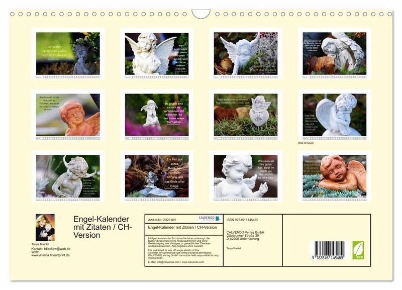 Der Engel ist ein Symbol des Friedens, der Freiheit und der Hoffnung. Wunderschön ausgearbeitete Fotografien von Tanja Riedel und ausgewählte Zitate von großen Persönlichkeiten unserer Zeit, Begleiten Sie Monat für Monat durch das Jahr.