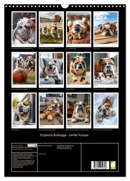 Sie sieht zwar grimmig aus, aber die Englische Bulldogge hat ein gutmütiges und liebenswürdiges Wesen. Sie fühlt sich sehr wohl als Familienhund, denn sie ist loyal, genügsam und gelassen. Aber sie hat auch ihren Dickkopf und wenn man sie zurückweist, kann sie ganz schön stur sein. Der Fotokünstler Peter Roder hat hinreißende KI-Bilder gestaltet und zusammengestellt. Nicht nur ein Muss für jeden Englische Bulldogge-Liebhaber sondern für alle TierliebhaberInnen!