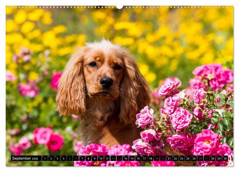 September: Roter Cocker zwischen Rosen und gelben Blumen