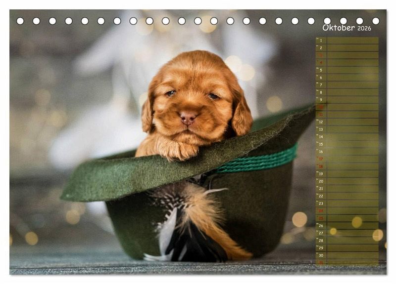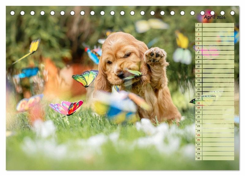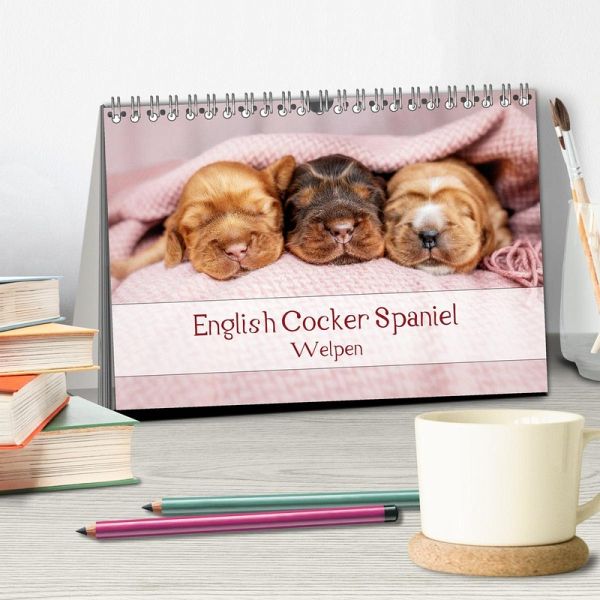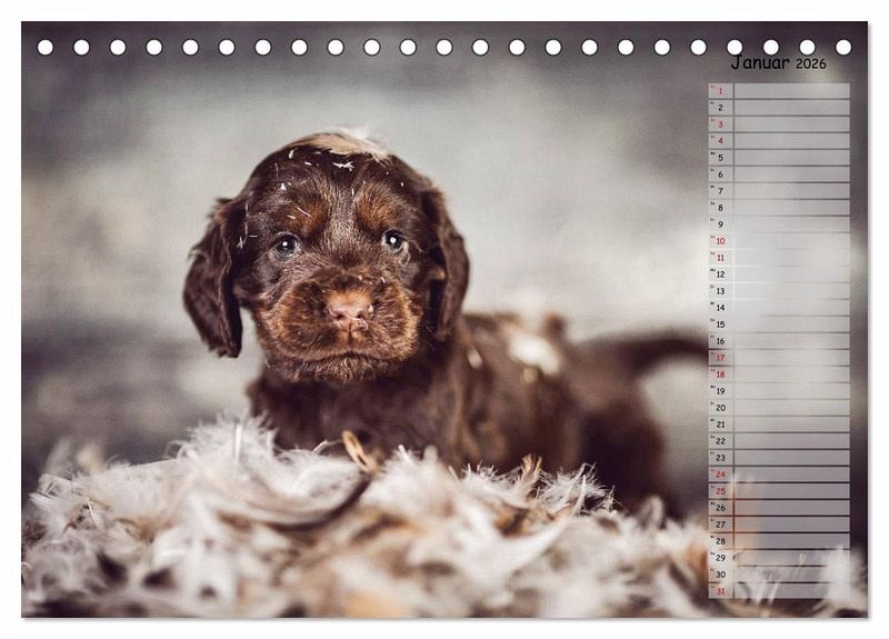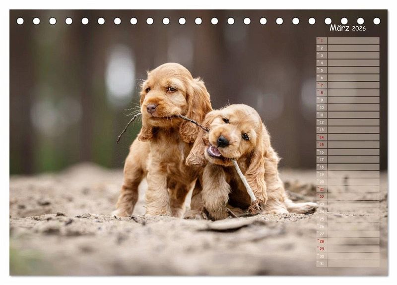 Ein Monatskalender mit English Cocker Spaniel Welpen fotografisch von Sabrina Wobith Photography in Szene gesetzt. Eine Notizfunktion zum eintragen von Terminen oder Geburtstagen ist gegeben. Erfreuen Sie sich auf ein zuckersüßes Bild jeden Monat.