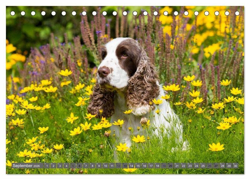 September: weiß-brauner Cocker im gelben Blumenbeet