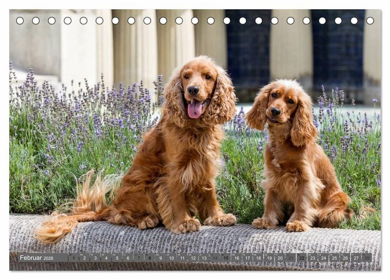 Februar: zwei rote Cocker sitzen vor Lavendel