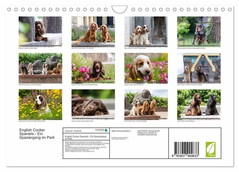 QUALITÄT - Hochwertiger Fotokalender mit 12 wunderschönen Motiven auf lichtbeständigem Bilderdruckpapier, robuste Spiralbindung mit Aufhängebügel.NACHHALTIG - deutliche Abfallreduzierung durch bedarfsgerechte Einzelstückfertigung, umweltfreundliches FSC-zertifiziertes Papier, Produktion in Deutschland, klimabewusste Logistik.PERFEKTES GESCHENK - Kalender für Freunde und Familie, für Kinder und Erwachsene, jung und alt, zu Weihnachten, Geburtstag oder zwischendurch.VIELFALT - Bildkalender in verschiedenen Formaten, z.B. DINA5, DIN A4, DIN A3 sowie DIN A2. Ob Naturmotiv, Gemälde oder Fotos, ideal für ein persönliches Wohlfühlambiente.English Cocker Spaniel im Park auf der Mathildenhöhe von Autor(in): Fotodesign Verena Scholze