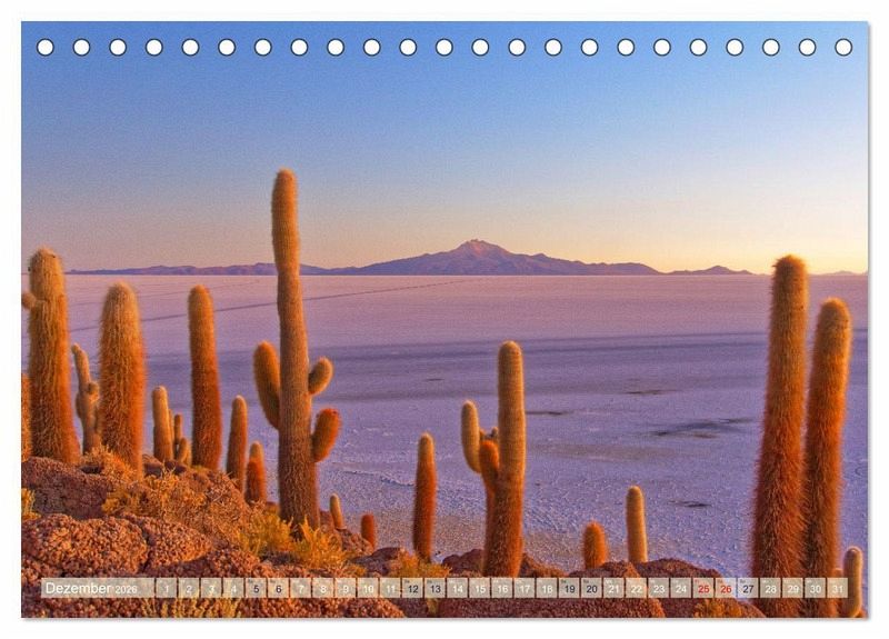 Bolivien gilt bei weitem nicht als unentdeckt, doch vergleicht man es mit Nachbarländern wie Peru, Chile oder Brasilien, gerät es schnell in Vergessenheit. Dabei bietet es neben der weltbekannten Salar de Uyuni weitere surrealistische Landschaftsstriche auf der Andenhochebene, spannende Wanderungen, quirlige Städte und natürlich das artenreiche Amazonasbecken. Bolivien steht für ein Abenteuer, ein Abenteuer, welches auf 12 Kalenderbilder gebannt wurde.
