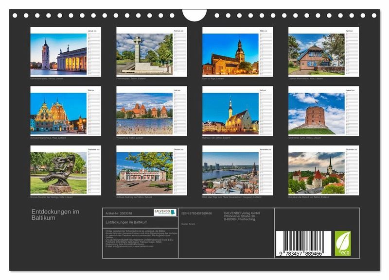 Das Baltikum besteht aus den Staaten Estland, Lettland und Litauen. Die drei Länder gehören zur Europäischen Union und haben den Euro als gesetzliches Zahlungsmittel. Zwischen 1940 und 1990 gehörten die Staaten zur Sowjetunion. Besonders die Hauptstädte sind eine Reise wert. Tallin, die Hauptstadt von Estland wurde 1997 zur Liste des UNESCO-Weltkulturerbe hinzugefügt als "Beispiel einer außergewöhnlich gut und vollständig erhaltenen nordeuropäischen, mittelalterlichen Handelsstadt an der Küste der Ostsee". Riga, die Hauptstadt von Lettland ist eine alte Hansestadt und berühmt für ihre schöne Altstadt und ihre Jugendstilbauten. Die Innenstadt Rigas wurde 1997 zur Liste des UNESCO-Weltkulturerbe hinzugefügt. 2014 war Riga Kulturhauptstadt Europas. Vilnius, die Hauptstadt von Litauen hat eine malerische Altstadt. Aufgrund der mehr als 50, über die Stadt verteilten Kirchen, erhält Vilnius auch den Beinamen "Rom des Ostens". Die UNESCO hat die zu den besterhaltenen Altstädten Europas zählende Altstadt von Vilnius in die Liste des Weltkulturerbes aufgenommen. Dieser Kalender ist ein Planer.