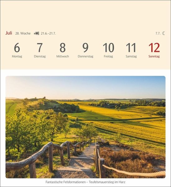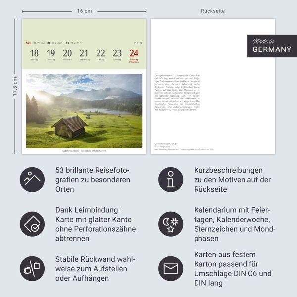 - Ein dekorativer Kalender mit Postkarten der stimmungsvollsten Orte Deutschlands: Schmückt jeden Tisch und jede Wand!- Unsere Heimat von ihrer schönsten Seite: Wochen-Tischkalender zum Aufstellen oder Aufhängen- Deutschland entdecken: Hübsche Städtchen und malerische Landschaften in einem kleinen Kalender im Postkartenformat- Glücksorte aus ganz Deutschland: Tischkalender mit 53 heraustrennbaren Postkarten im Format 16 x 17,5 cm zum Versenden und Verschenken- Hochwertige Landschaftskalender für Reise-Liebhaber: Fotokalender von Harenberg aus dem Athesia Kalenderverlag