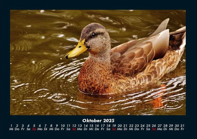 Enten 2025 Motivkalender DIN A4 Vero-Kalender erhalten Sie mit Motiven aus den verschiedensten Themenbereichen wie Natur, Blumen und Landschaft, Tierwelt, Architektur, Reise und Urlaub, Technik, Automobil und Eisenbahn, Emotionen, Sport und Musik. Gedruckt werden die Monats-Kalender aus dem Vero Verlag auf hochwertigem Kalenderbogen in Premium-Qualität und verschiedenen Größen. Die Vielfältigkeit der Motive unserer Foto-Kalender ist dank der Zusammenarbeit mit kreativen Fotografen möglich.