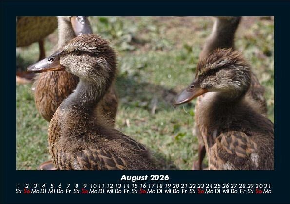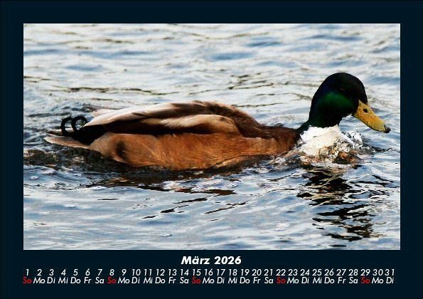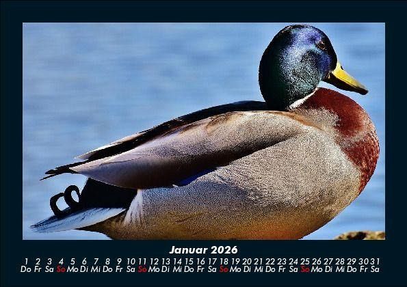 Enten 2026 Motivkalender DIN A5 Dieser Kalender zeigt die verschiedenen Enten in ihrer natürlichen Umgebung. Vero-Kalender erhalten Sie mit Motiven aus den verschiedensten Themenbereichen wie Natur, Blumen und Landschaft, Tierwelt, Architektur, Reise und Urlaub, Technik, Automobil und Eisenbahn, Emotionen, Sport und Musik. Gedruckt werden die Monats-Kalender aus dem Vero Verlag auf hochwertigem Kalenderbogen in Premium-Qualität und verschiedenen Größen. Die Vielfältigkeit der Motive unserer Foto-Kalender ist dank der Zusammenarbeit mit kreativen Fotografen möglich.