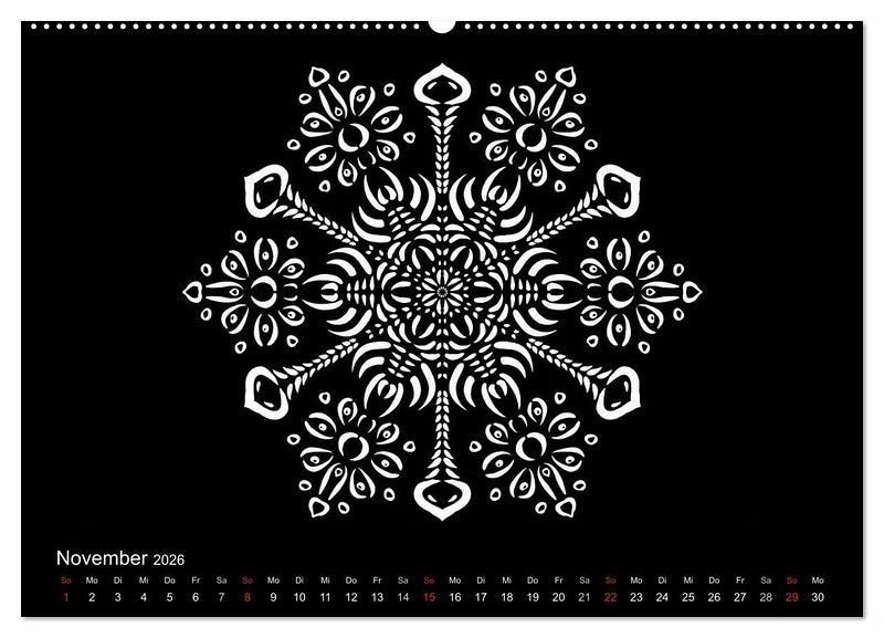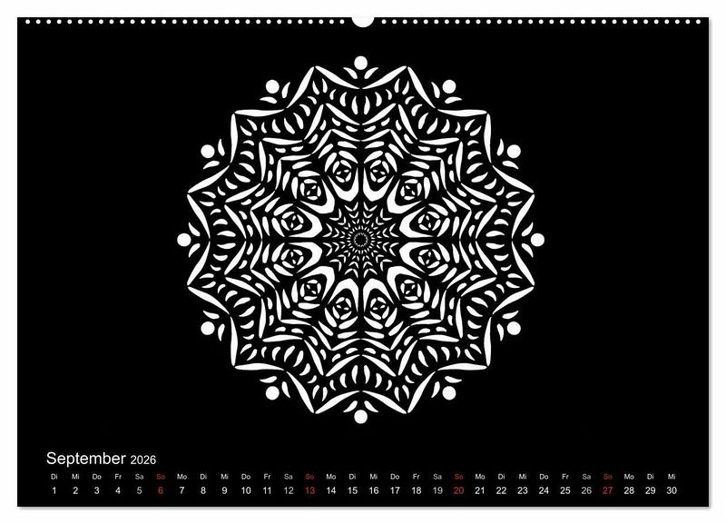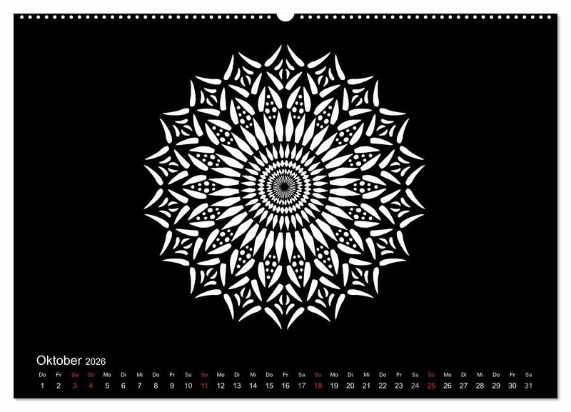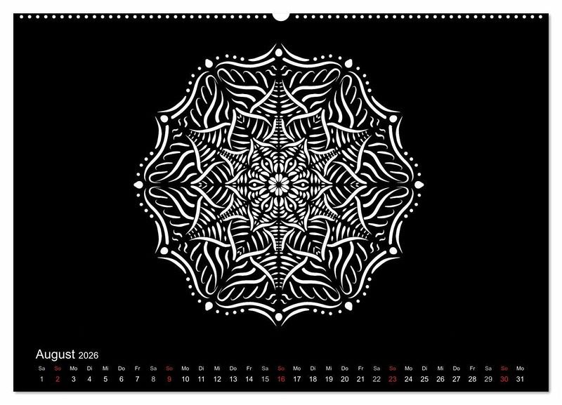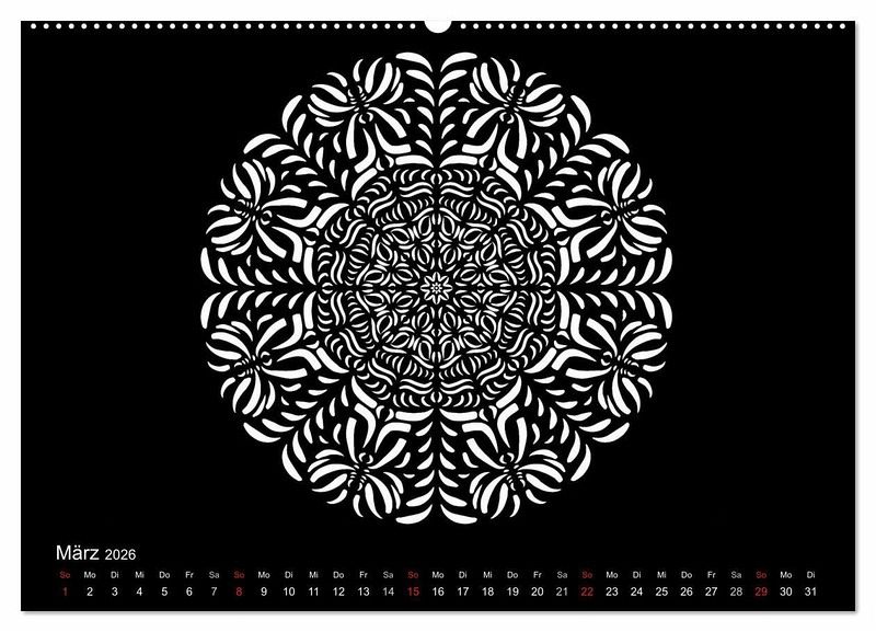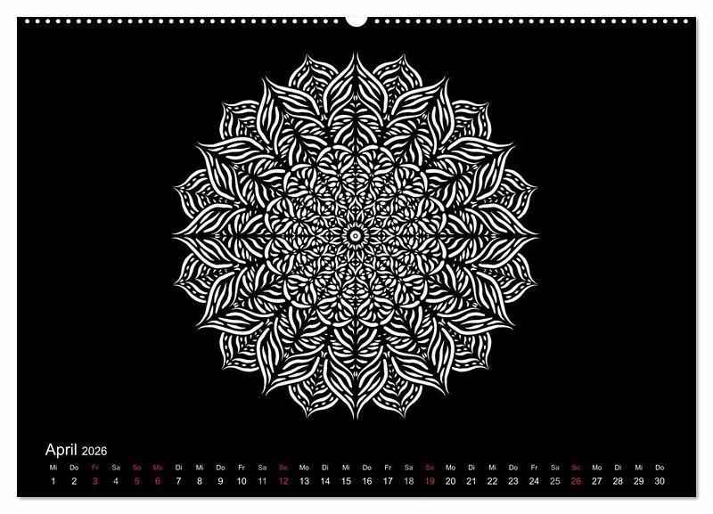 Weiße Mandalas auf schwarzem Grund verleihen diesem Kalender Ruhe und Ausgeglichenheit. Wer es lieber bunt mag, der kann die Mandalas auch farbig ausmalen und so dem Kalender seinen eigenen Stil geben.