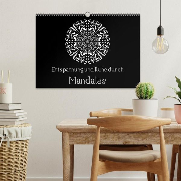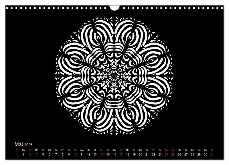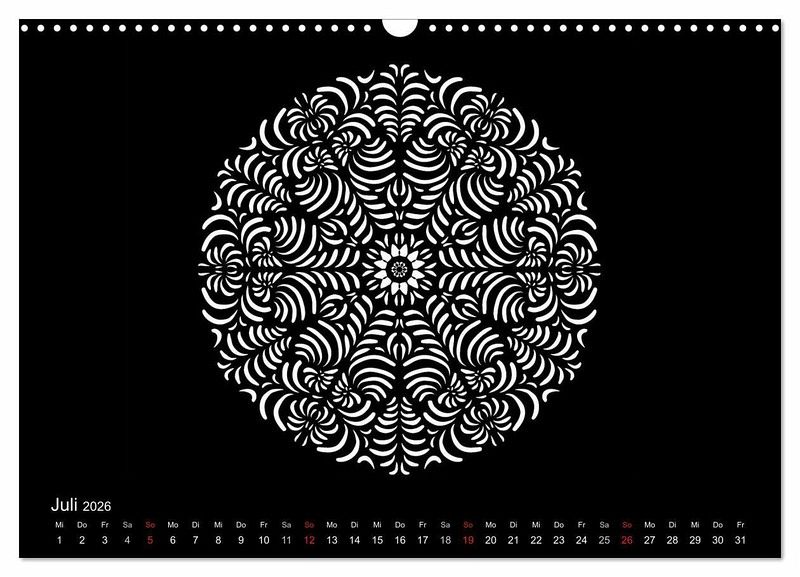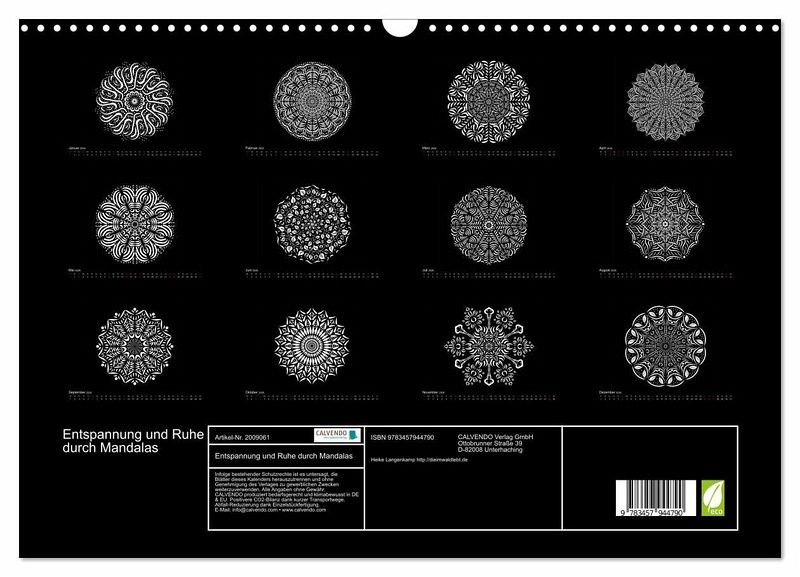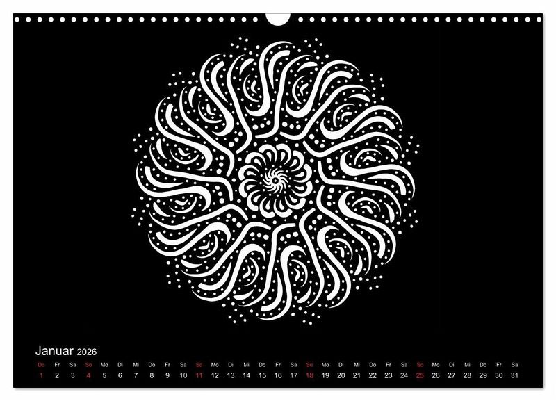 Weiße Mandalas auf schwarzem Grund verleihen diesem Kalender Ruhe und Ausgeglichenheit. Wer es lieber bunt mag, der kann die Mandalas auch farbig ausmalen und so dem Kalender seinen eigenen Stil geben.
