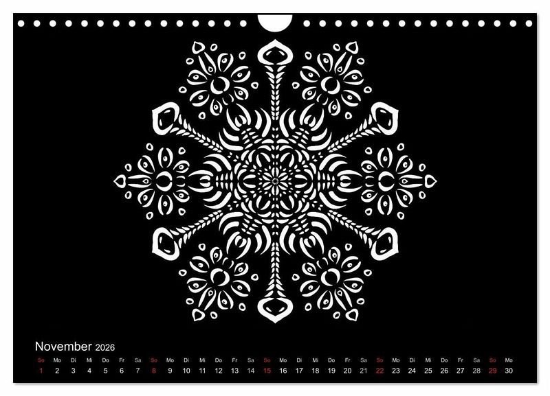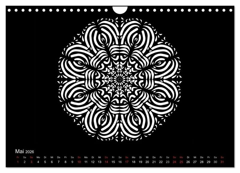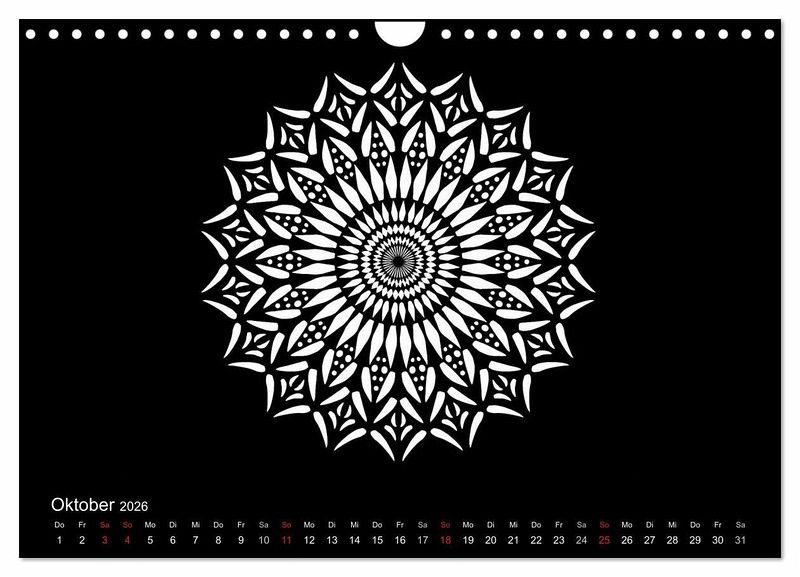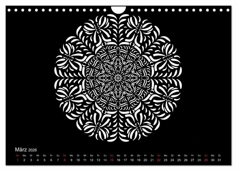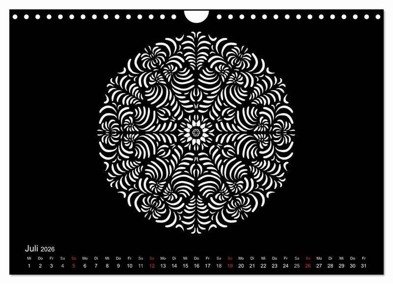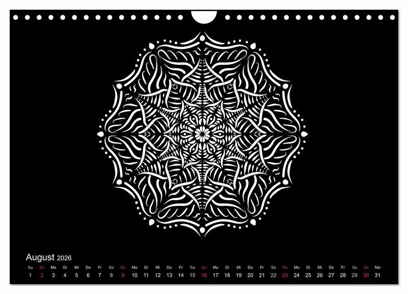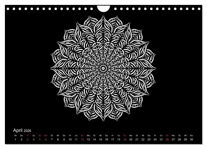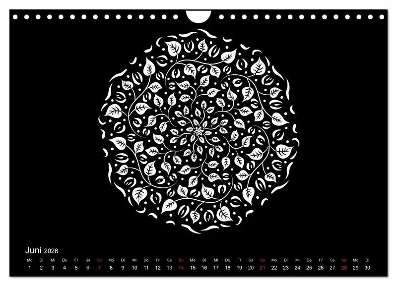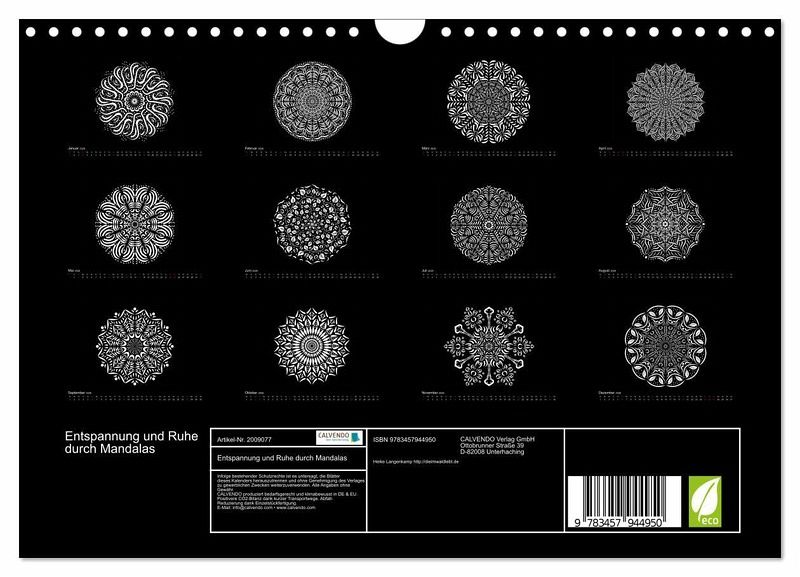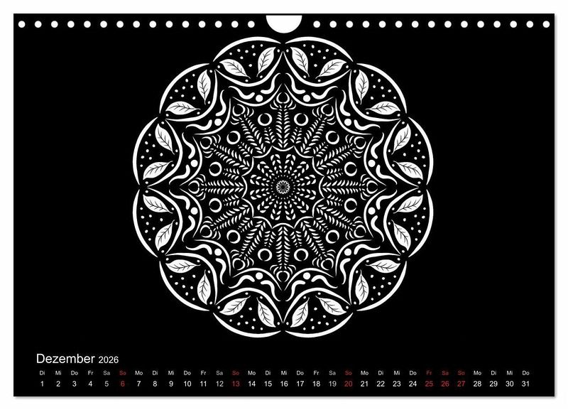 Weiße Mandalas auf schwarzem Grund verleihen diesem Kalender Ruhe und Ausgeglichenheit. Wer es lieber bunt mag, der kann die Mandalas auch farbig ausmalen und so dem Kalender seinen eigenen Stil geben.