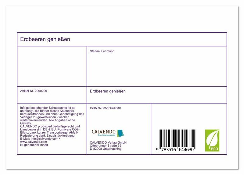 QUALITÄT - Hochwertiger Fotokalender mit 12 wunderschönen Motiven auf lichtbeständigem Bilderdruckpapier, robuste Spiralbindung.NACHHALTIG - deutliche Abfallreduzierung durch bedarfsgerechte Einzelstückfertigung, umweltfreundliches FSC-zertifiziertes Papier, Produktion in Deutschland, klimabewusste Logistik.PERFEKTES GESCHENK - Kalender für Freunde und Familie, für Kinder und Erwachsene, jung und alt, zu Weihnachten, Geburtstag oder zwischendurch.VIELFALT - Bildkalender in verschiedenen Formaten, z.B. DIN A5, DIN A4, DIN A3 sowie DIN A2. Ob Naturmotiv, Gemälde oder Fotos, ideal für ein persönliches Wohlfühlambiente.So schmecken Erdbeeren: süß und unwiderstehlich! von Autor(in): Steffani Lehmann