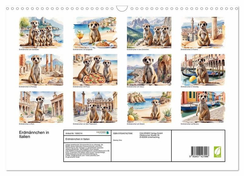 QUALITÄT - Hochwertiger Fotokalender mit 12 wunderschönen Motiven auf lichtbeständigem Bilderdruckpapier, robuste Spiralbindung mit Aufhängebügel.NACHHALTIG - deutliche Abfallreduzierung durch bedarfsgerechte Einzelstückfertigung, umweltfreundliches FSC-zertifiziertes Papier, Produktion in Deutschland, klimabewusste Logistik.PERFEKTES GESCHENK - Kalender für Freunde und Familie, für Kinder und Erwachsene, jung und alt, zu Weihnachten, Geburtstag oder zwischendurch.VIELFALT - Bildkalender in verschiedenen Formaten, z.B. DIN A5, DIN A4, DIN A3 sowie DIN A2. Ob Naturmotiv, Gemälde oder Fotos, ideal für ein persönliches Wohlfühlambiente.Die Erdmännchen machen Urlaub in Italien von Autor(in): Stanley Hinz
