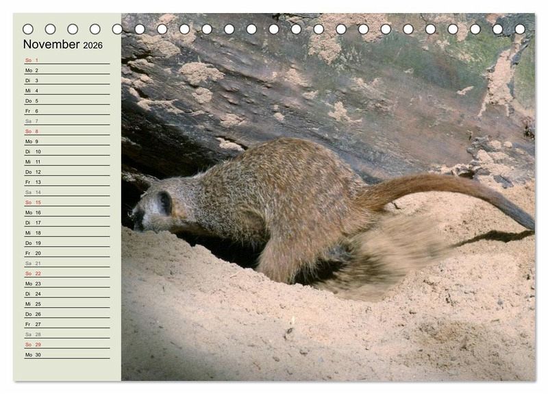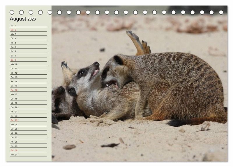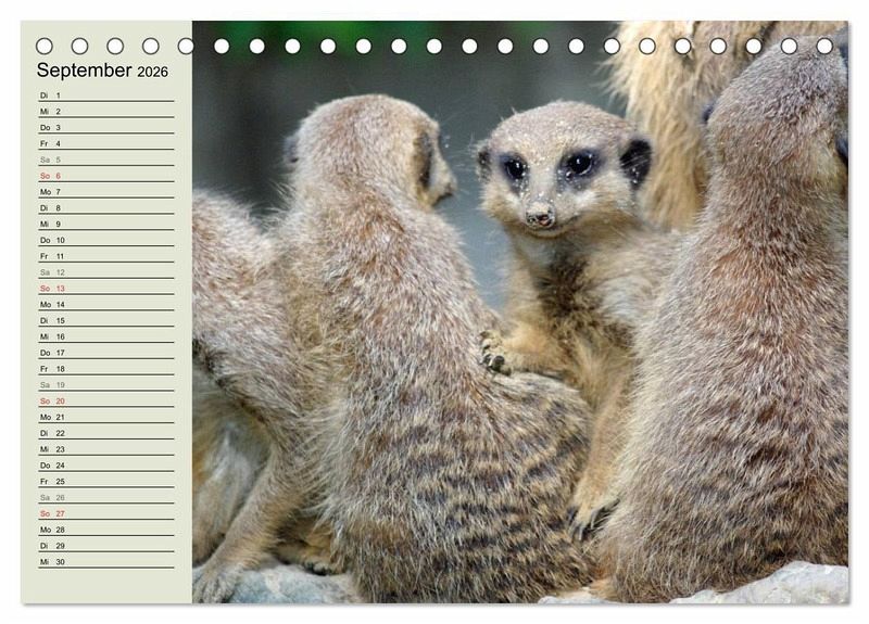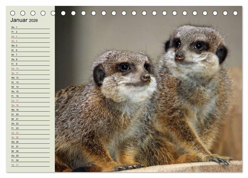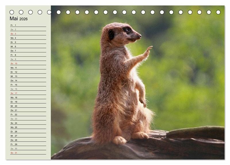 Ein paar dieser wunderbaren Momente aus dem Familenleben der Erdmännchen wurden von einer Tierfotografin eingefangen und in diesem schönen Termink- oder Geburtstagskalender mit seinen 12 Motiven veröffentlicht. An der linken Seite der Fotos ist viel Platz für Einträge - so wird kein Geburtstag oder Termin mehr verpasst.