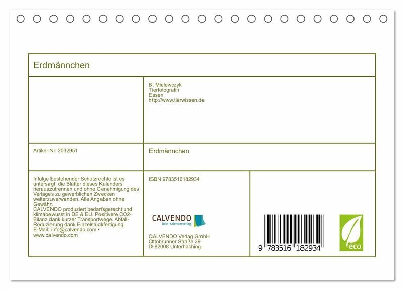 QUALITÄT - Hochwertiger Fotokalender mit 12 wunderschönen Motiven auf lichtbeständigem Bilderdruckpapier, robuste Spiralbindung.NACHHALTIG - deutliche Abfallreduzierung durch bedarfsgerechte Einzelstückfertigung, umweltfreundliches FSC-zertifiziertes Papier, Produktion in Deutschland, klimabewusste Logistik.PERFEKTES GESCHENK - Kalender für Freunde und Familie, für Kinder und Erwachsene, jung und alt, zu Weihnachten, Geburtstag oder zwischendurch.VIELFALT - Bildkalender in verschiedenen Formaten, z.B. DIN A5, DIN A4, DIN A3 sowie DIN A2. Ob Naturmotiv, Gemälde oder Fotos, ideal für ein persönliches Wohlfühlambiente.Erdmännchen - sie verzaubern jeden Tierfreund von Autor(in): Barbara Mielewczyk